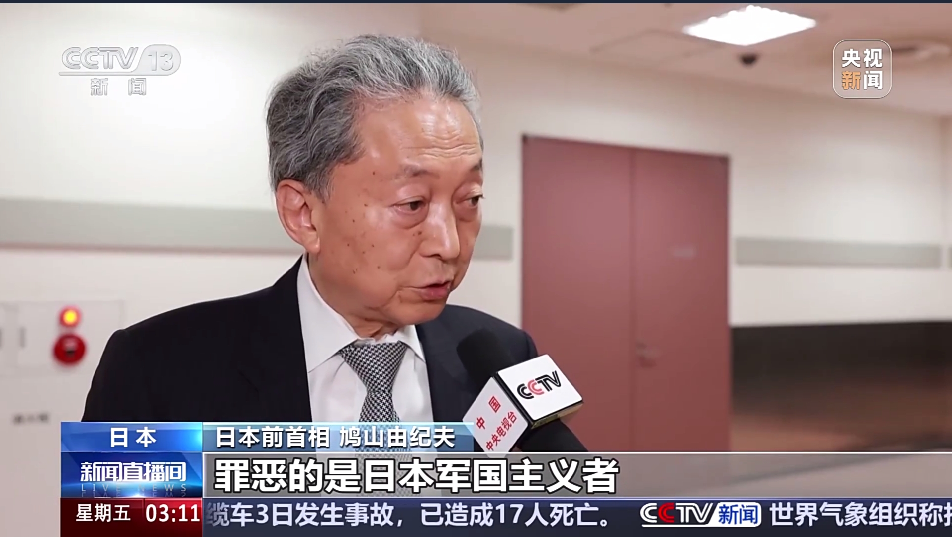 بیجنگ (نیوز ڈیسک) چین میں جاپانی جارحیت کے خلاف چینی عوام کی مزاحمتی جنگ اور عالمی فاشسٹ مخالف جنگ کی فتح کی 80 ویں سالگرہ کے موقع پر منعقدہ یادگاری تقریب میں شرکت کے بعد جاپان کے سابق وزیرِ اعظم یوکیو ہاتویاما نے چائنا میڈیا گروپ کو خصوصی انٹرویو دیتے ہوئے کہا کہ وہ اس بار معافی اور ندامت کے جذبے کے ساتھ چین گئے تھے۔