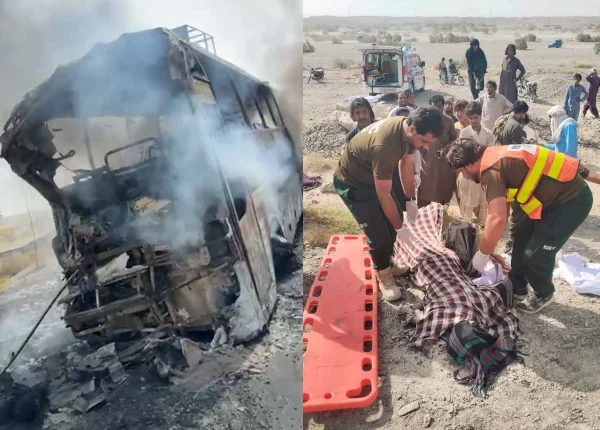 پنجگور میں مسافر بس اور ایرانی تیل سے بھری گاڑی میں تصادم، 8 افراد جھلس کر جاں بحق، 3 زخمی